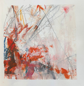 Christine was searching for a balance of space and lively marks in the four small wooden blocks of pure abstract acrylic paintings she showed us. The colour palette and composition of all four was delightful and evocative, for me, of an alfresco environment but open to various interpretations.